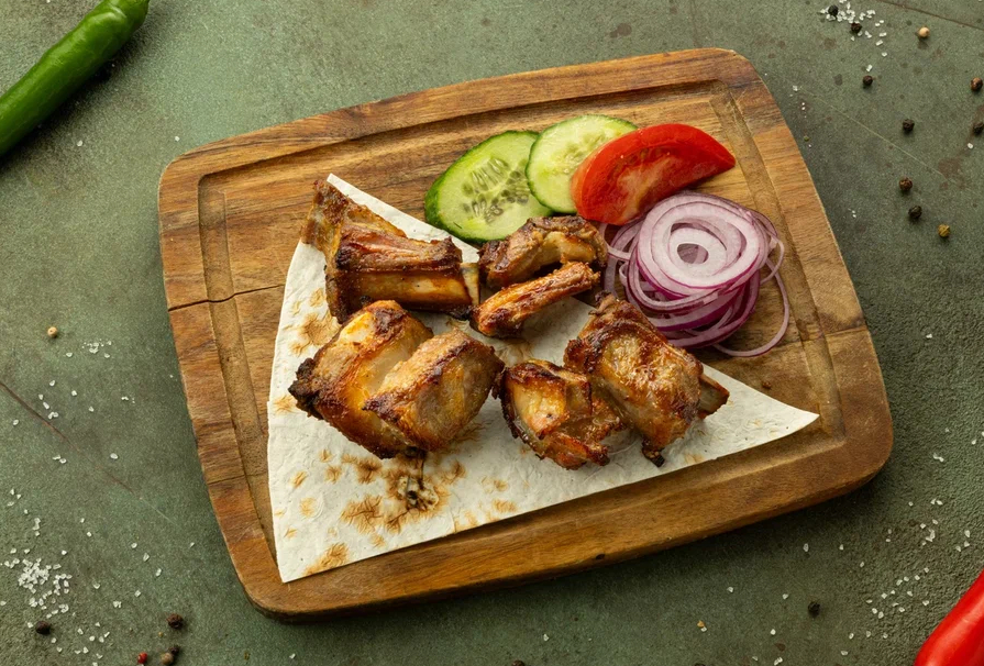Мякоть баранины, люля-кебаб из баранины, люля-кебаб из курицы, куриные крылья, шашлык из куриного бедра, , шашлык из свиной шейки, баранья корейка, красный лук, розовые помидоры , огурцы, лаваш.