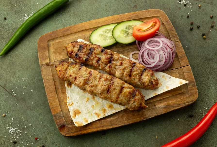 Люля-кебаб из курицы, красный лук, розовые помидоры , огурцы, лаваш, соус барбекю.