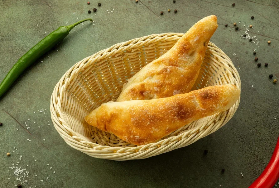 Тесто, сыр имеретинский, сыр сулугкни, масло растительное. Закрытый хачапури. Сверху посыпается сыром.