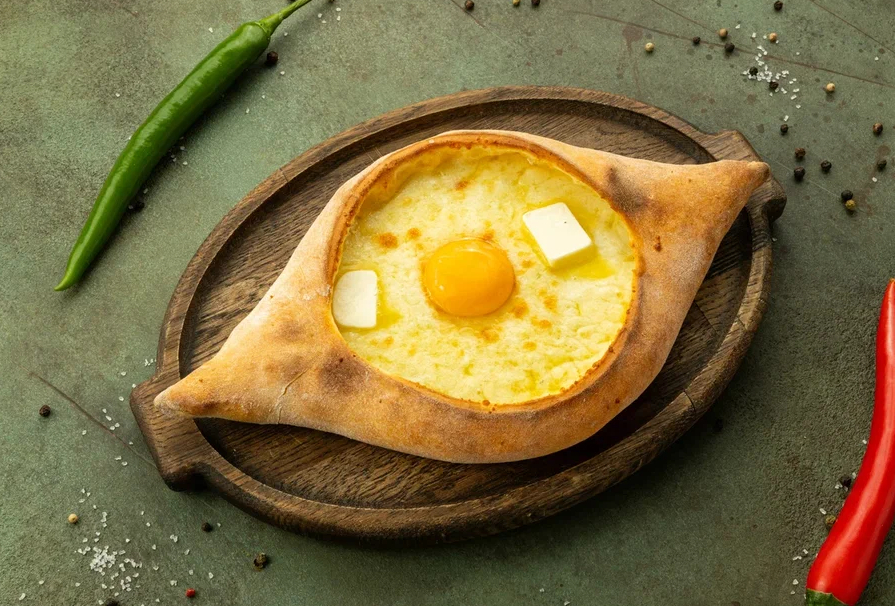 Тесто, сыр имеретинский, сыр сулугуни, яичный желток свежий. В форме лодочки.
