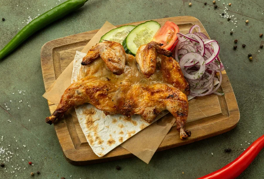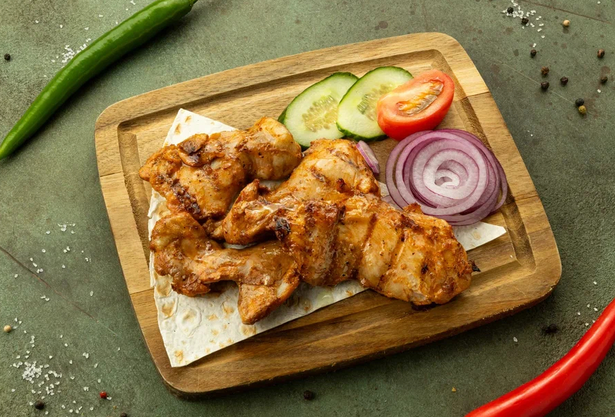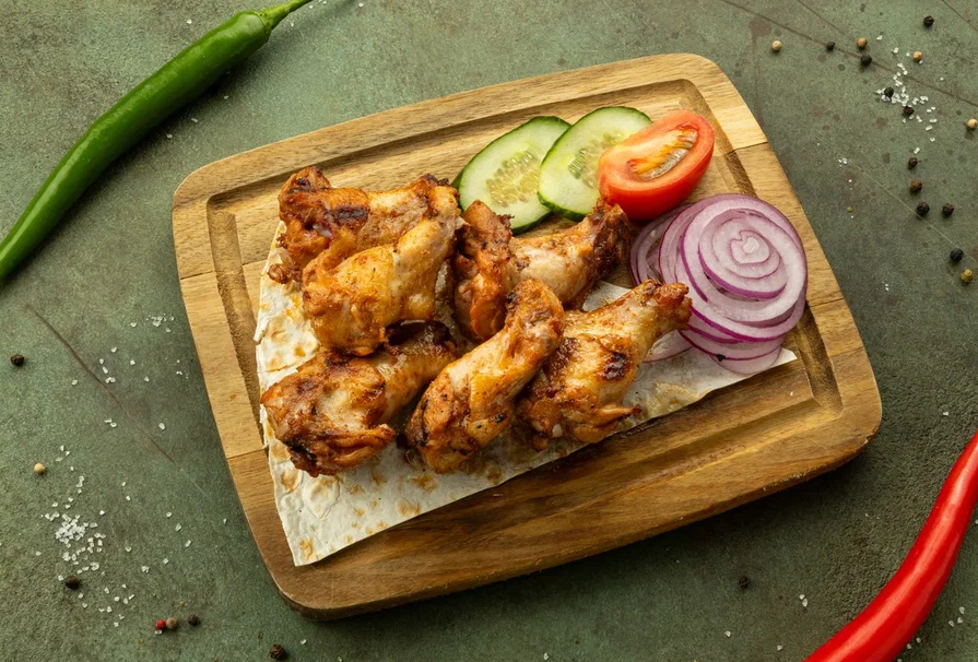 Куриные крылья, красный лук, розовые помидоры , огурцы, лаваш, соус барбекю.