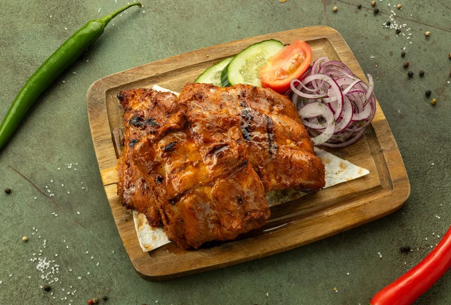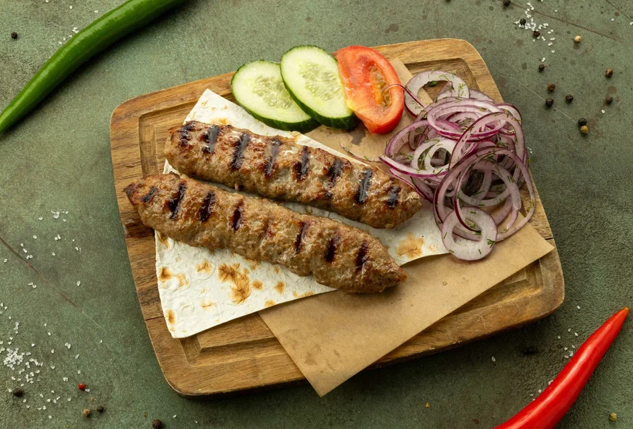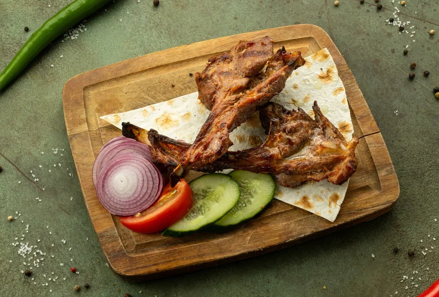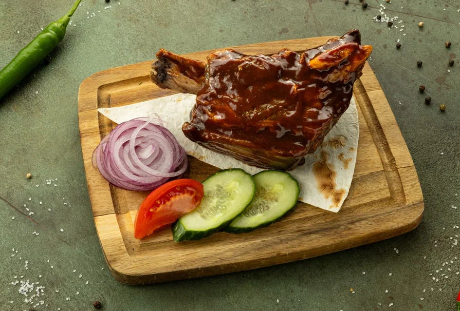 Говяжьи рёбрышки, красный лук, розовые помидоры, огурцы, лаваш, соус барбекю.