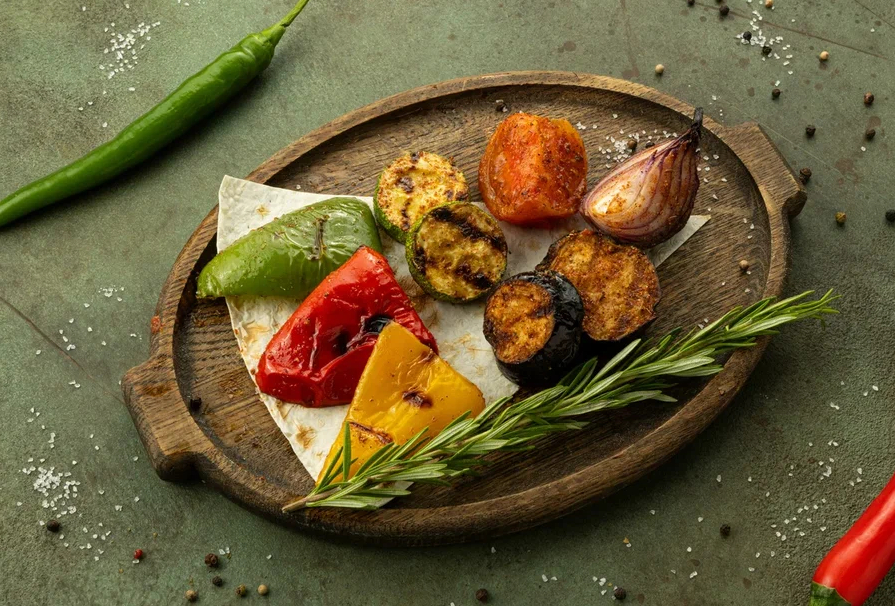 Запеченные на мангале баклажаны, кабачки, болгарский перец, помидоры,лук, соль.