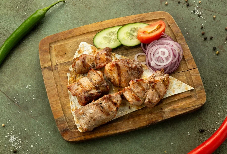 Свиная шея, красный лук, розовые помидоры , огурцы, лаваш, соус барбекю