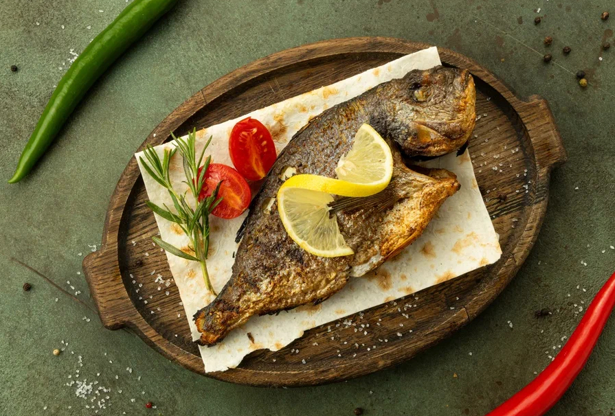 Сочная нежная ароматная целиковая рыба Дорадо, долька лимона, соль, перец, растительное масло, грузинские специи