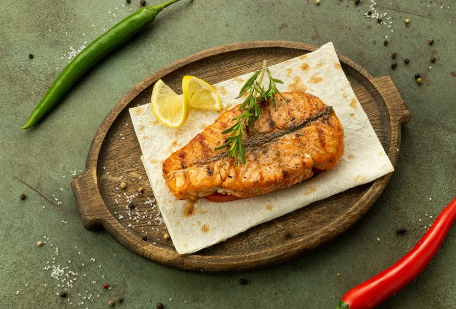 Нежный и сочный стейк из сёмги приготовленная на углях, розовые томаты, долька лимона, соль, перец, растительное масло, специи грузинские, зелень, лаваш.