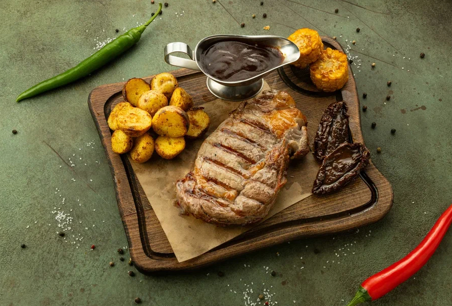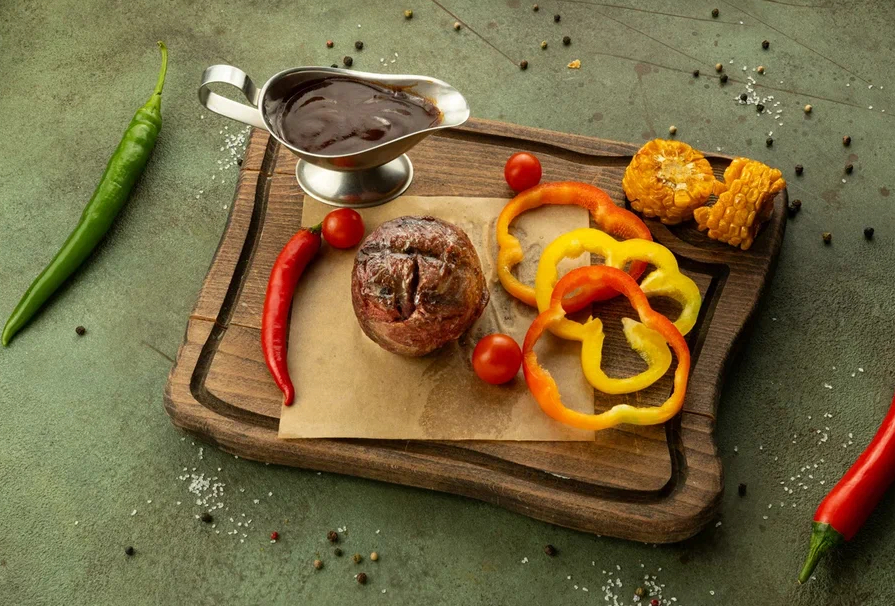 Мраморная говядина Black Angus, болгарский перец, перец чили, сельдерей, помидор черри , кукуруза гриль, соус барбекю