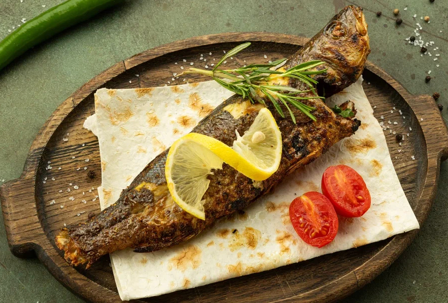 Сочная нежная ароматная целиковая рыба Сибас, долька лимона, соль, перец, растительное масло, грузинские специи.